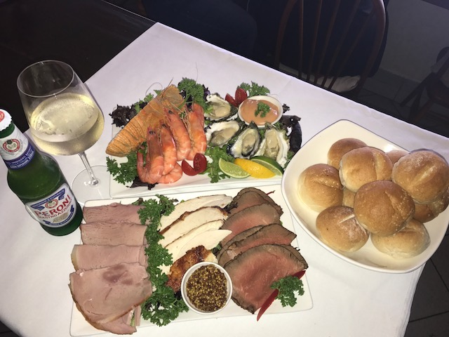 3. Seafood & Charcuterie Plate - 3 oysters, 4 prawns, 1/2 Moreton bay bug; Fresh gourmet salads will include garden salads, potato salad & tropical pineapple salad. Dinner rolls & butter.